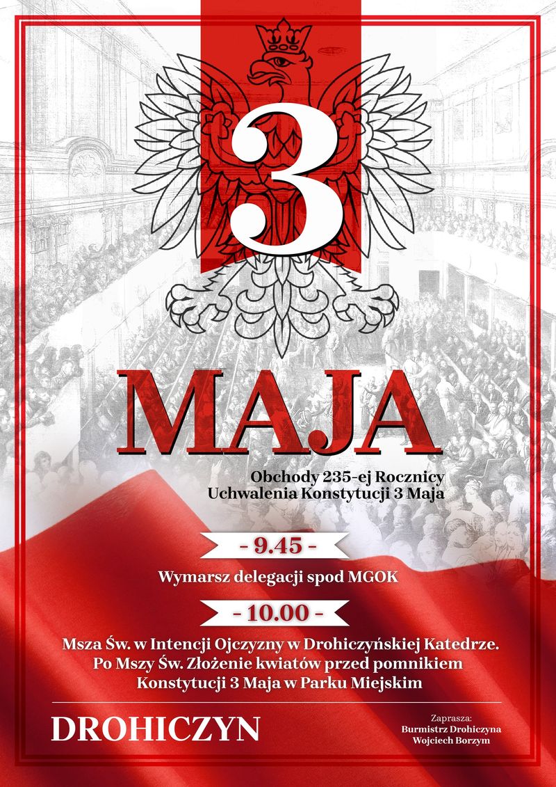 W niedzielę, 3 maja w Drohiczynie odbędą się uroczyste obchody 235. rocznicy uchwalenia Konstytucja 3 Maja. O godz. 9.45 zaplanowano wymarsz delegacji spod Miejsko-Gminnego Ośrodka Kultury, a o 10.00 Mszę Świętą w intencji Ojczyzny w Katedrze. Po nabożeństwie uczestnicy złożą kwiaty przy pomniku Konstytucji 3 Maja w Parku Miejskim.