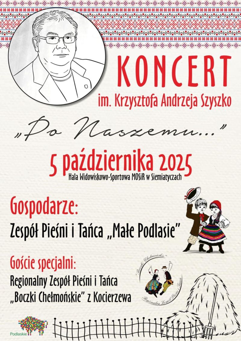 Koncert „Po naszemu…” im. Krzysztofa Andrzeja Szyszko odbędzie się w niedzielę, 5 października, o godzinie 17:00 w Hali Widowiskowo-Sportowej Miejskiego Ośrodka Sportu i Rekreacji w Siemiatyczach. Wydarzenie dedykowane jest pamięci Krzysztofa Andrzeja Szyszko – założyciela, wieloletniego choreografa i instruktora Zespołu Pieśni i Tańca „Małe Podlasie”.