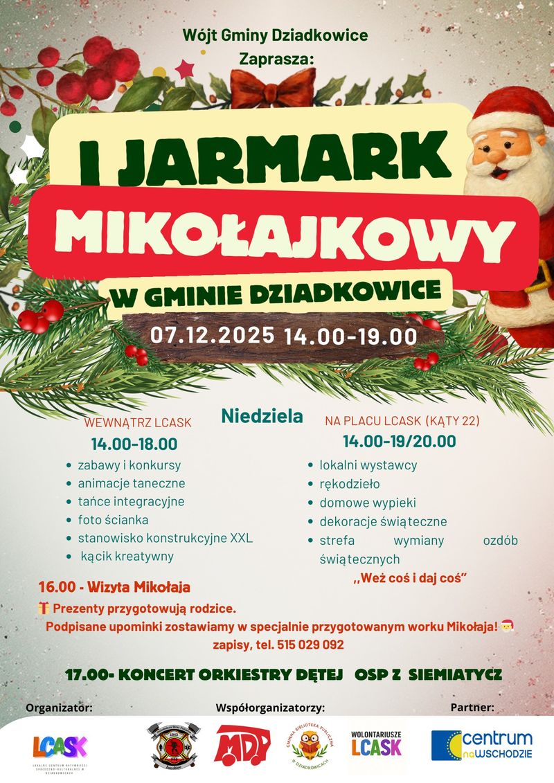 Wydarzenie ma być okazją do wspólnego spędzenia czasu i poczucia świątecznej atmosfery w gronie lokalnej społeczności. Na uczestników czeka wiele atrakcji zarówno w budynku LCASK, jak i na placu, więc każdy może znaleźć coś dla siebie. Jarmark to nowe przedsięwzięcie w gminie Dziadkowice, które ma szansę na stałe wpisać się w lokalne grudniowe tradycje.