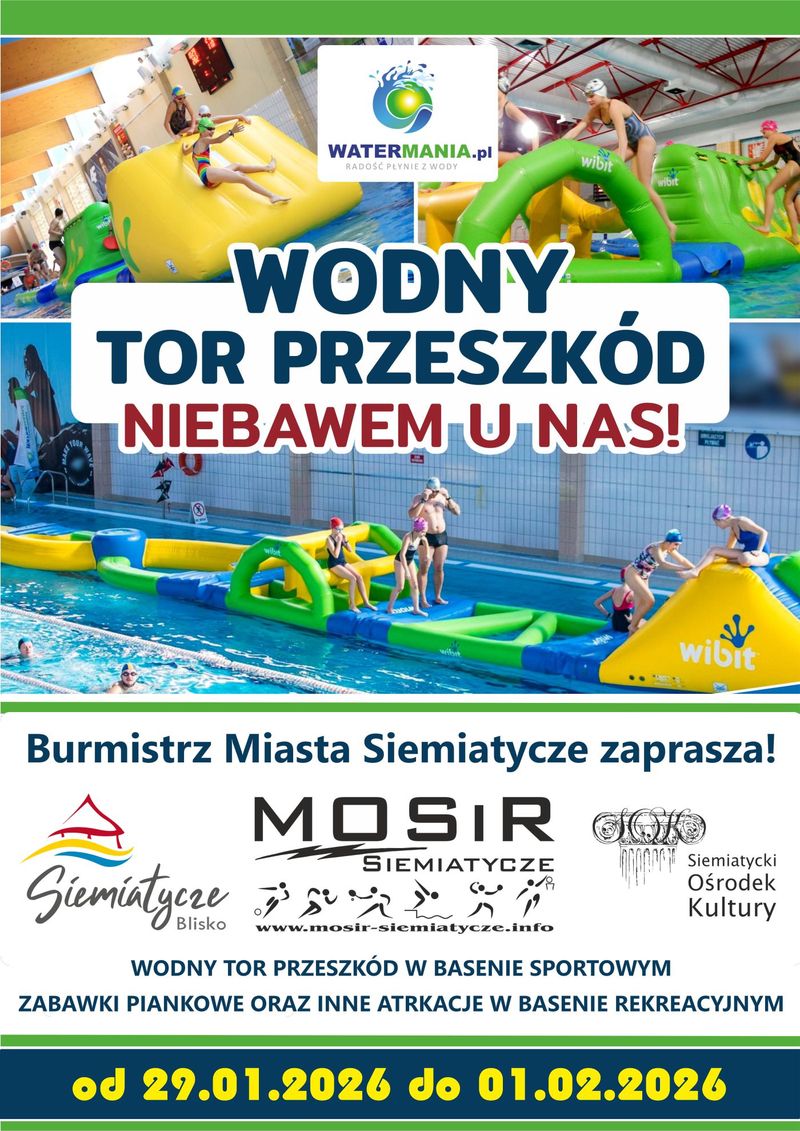 Wodny tor przeszkód będzie dostępny w Siemiatyczach w dniach od 29 stycznia do 1 lutego. Atrakcja zostanie udostępniona w basenie sportowym i będzie przeznaczona dla osób chcących aktywnie spędzić czas w wodzie. Równolegle w basenie rekreacyjnym dostępne będą zabawki piankowe oraz inne elementy urozmaicające pobyt na pływalni.