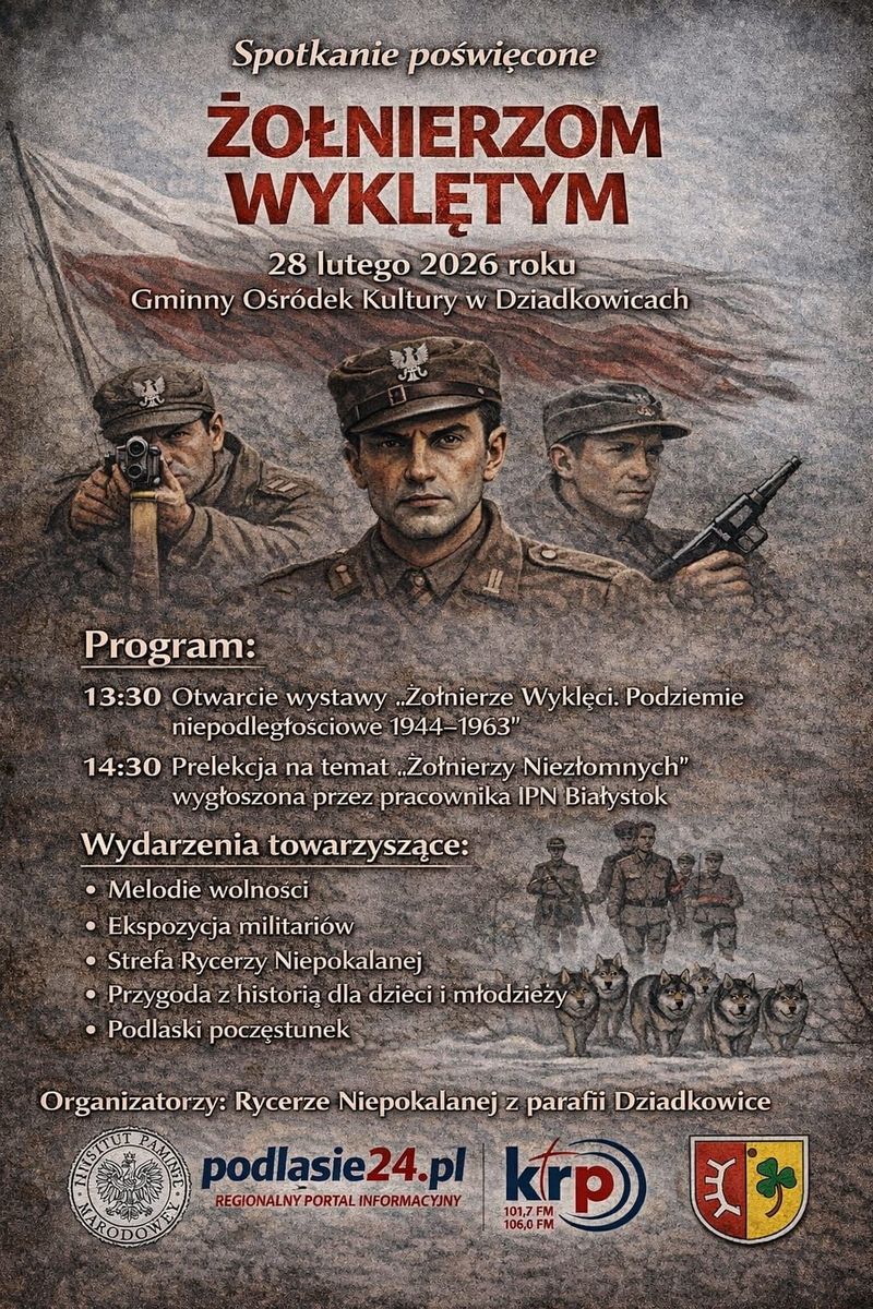 Uroczystości w Gminnym Ośrodku Kultury w Dziadkowicach (Kąty 22) rozpoczną się o godz. 13.30 otwarciem wystawy „Żołnierze Wyklęci. Podziemie Niepodległościowe 1944–1963”, przygotowanej i udostępnionej przez Instytut Pamięci Narodowej – Oddział w Lublinie. Ekspozycja przybliża losy powojennego podziemia niepodległościowego, ukazując dramatyczne wybory, odwagę i determinację tych, którzy pozostali wierni przysiędze.